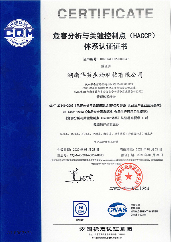 危害分析與關(guān)鍵控制點(diǎn)(HACCP)體系認(rèn)證證書